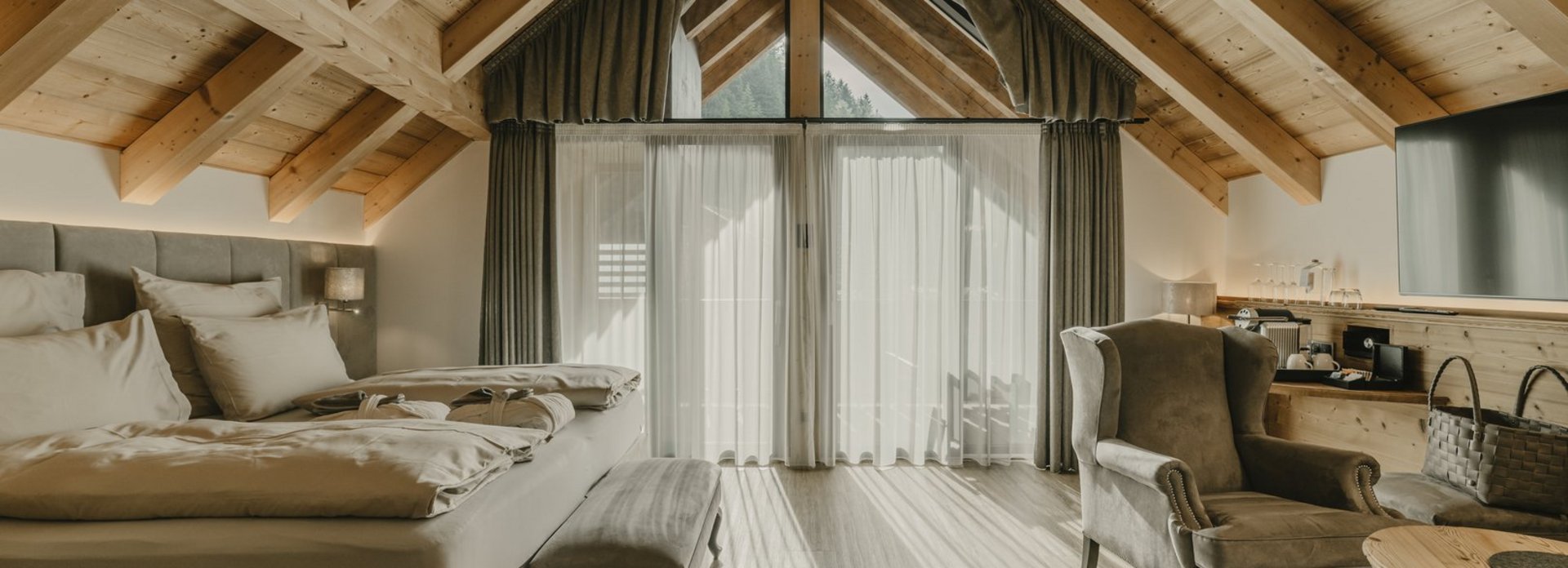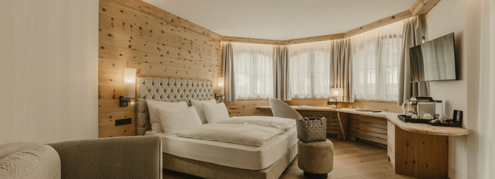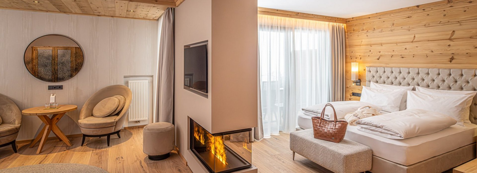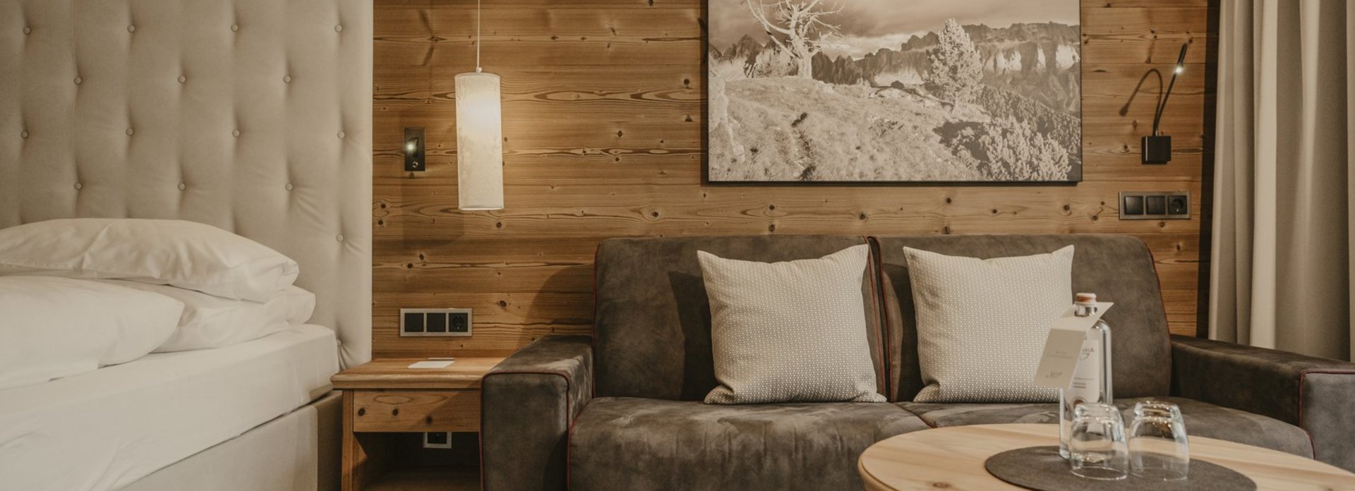 Cosy warmth and comfort, the scent of wood, and the magnificent view of the graceful Dolomites, captivating time and again. Romantic rooms and luxurious suites invite you to lean back and relax. Natural materials, alpine design and the highest comfort promise a unique living experience. A retreat of the highest order: the wellness suites with private outdoor sauna.